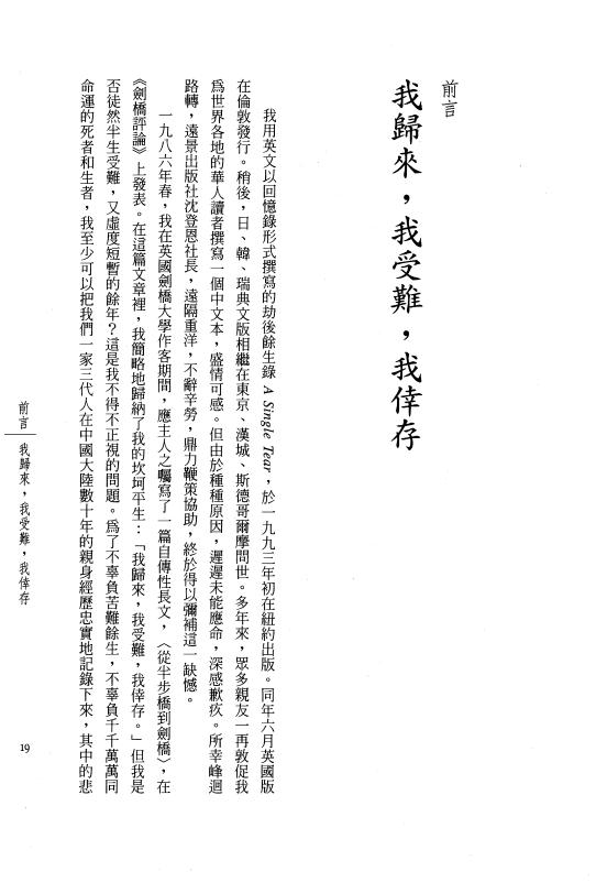 巫寧坤,一九二○年生於中國揚州。一九五七年「反右運動」中在北京國際關系學院被劃為「極右分子」,被開除公職,送北大荒勞改,一九六一年六月病危「保外就醫」。「文革」期間,關「牛棚」,一九七○年全家流放農村「接受貧下中農再教育」。一九七九年「錯劃右派」改正,返國際關系學院任英文系教授,一九九一年退休後定居美國。