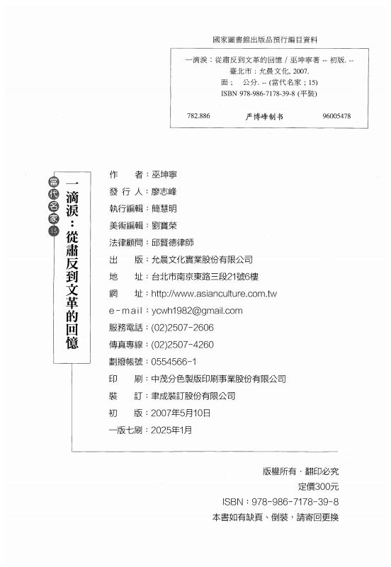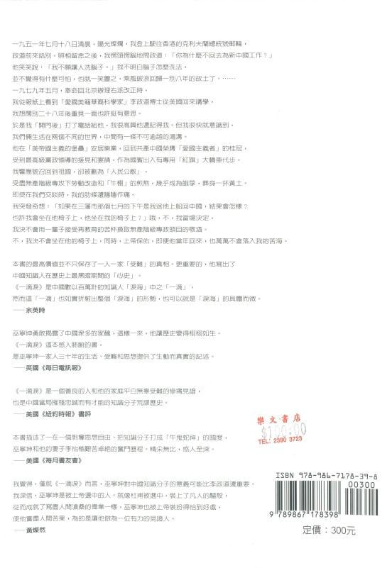《一滴淚》為巫寧坤三十年的生活、受難和思想提供了生動而真實的記述,完整呈現中國知識分子從五○年代初至七○年代末的全幅圖景。他讓歷史栩栩如生,因為每句話都可信;也因為不是控訴,不是吶喊,沒有火氣,讀來更是感人肺腑。