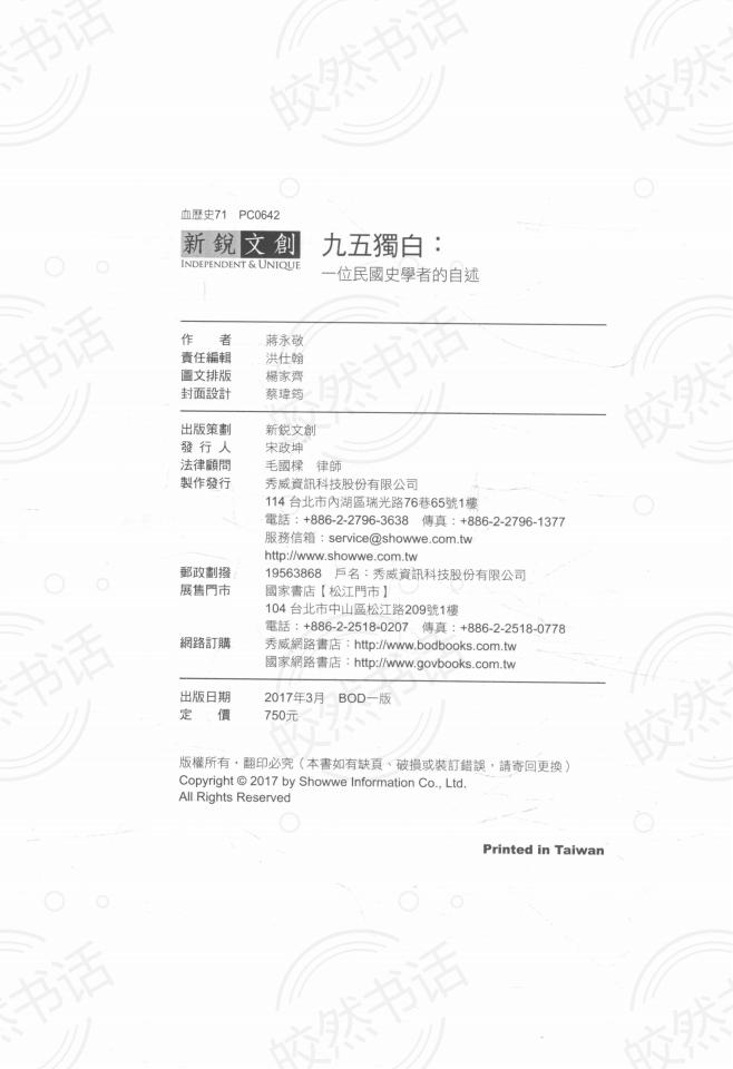 本書是民國史學者蔣永敬從出生迄今九十五年來的回憶錄。