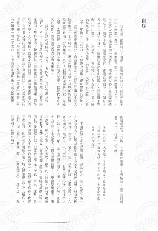 本書的前半部是作者記述從青少年時期避難、流亡、求學與從軍的經過;後半部則描述作者治學、教學與兩岸史學界的交流活動,以及對兩岸政局的雜感。前後兩部足以反映作者對這一時代變化的感受。