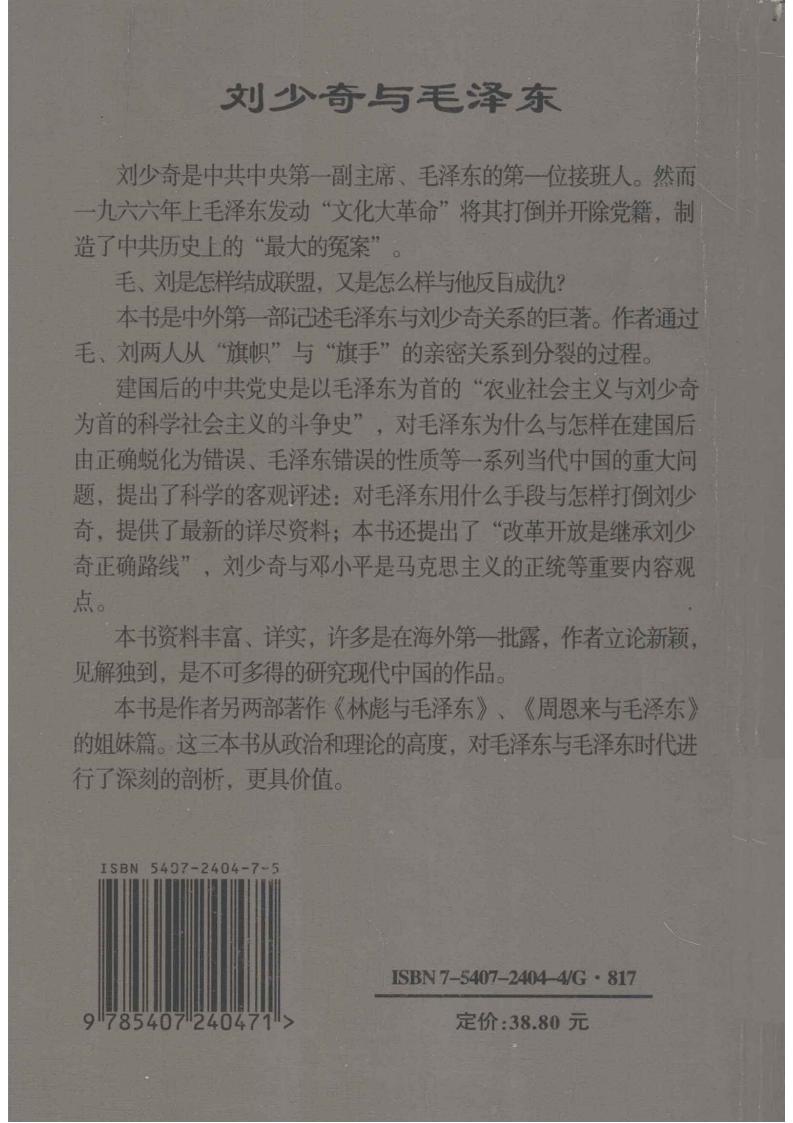本书是中外第一部记述毛泽东与刘少奇关系的巨著。作者通过毛、刘两人从“旗帜”与“旗手”的亲密关系到分裂的过程。