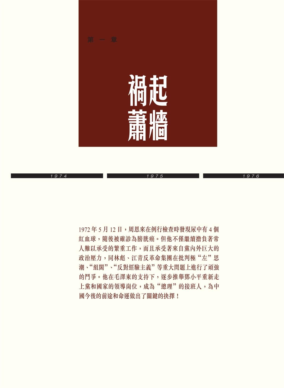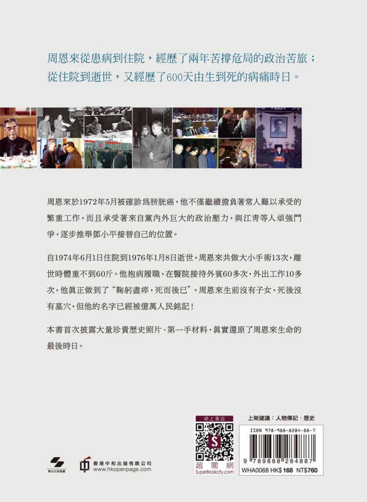 本书真实地记录了周恩来总理从患病、住院到逝世的最后生命岁月,生动地展现了周恩来总理与江青反革命集团进行顽强斗争并在毛泽东主席的支持下,逐步推举邓小平重新走上党和国家的领导岗位的过程,表现了周恩来总理崇高的理想信念、坚定的革命意志和伟大的人格力量。周恩来从患病到住院,经历了两年苦撑危局的政治苦旅;从住院到逝世,又经历了600天由生到死的病痛时日。周恩来从1972年5月12日,检查出尿中有癌细胞,随后被确诊为膀胱癌。他不仅继续担负着常人难以承受的繁重工作,而且承受着来自党内外巨大的政治压力,同林彪、江青反革命集团在批判极“左”思潮、“组阁”、“反对经验主义”等重大问题上进行了顽强的斗争。他在毛泽东的支持下,逐步推举邓小平重新走上党和国家的领导岗位,为中国今后的前途和命运作出了重大贡献。自1974年6月1日住院到1976年1月8日逝世,周恩来生命的最后600天里,共做大小手术13次。周恩来生命最后的岁月,伴随着病痛、负重、伤感、离别与希望,他将自己毕生的精力全部奉献给了党和国家的事业。