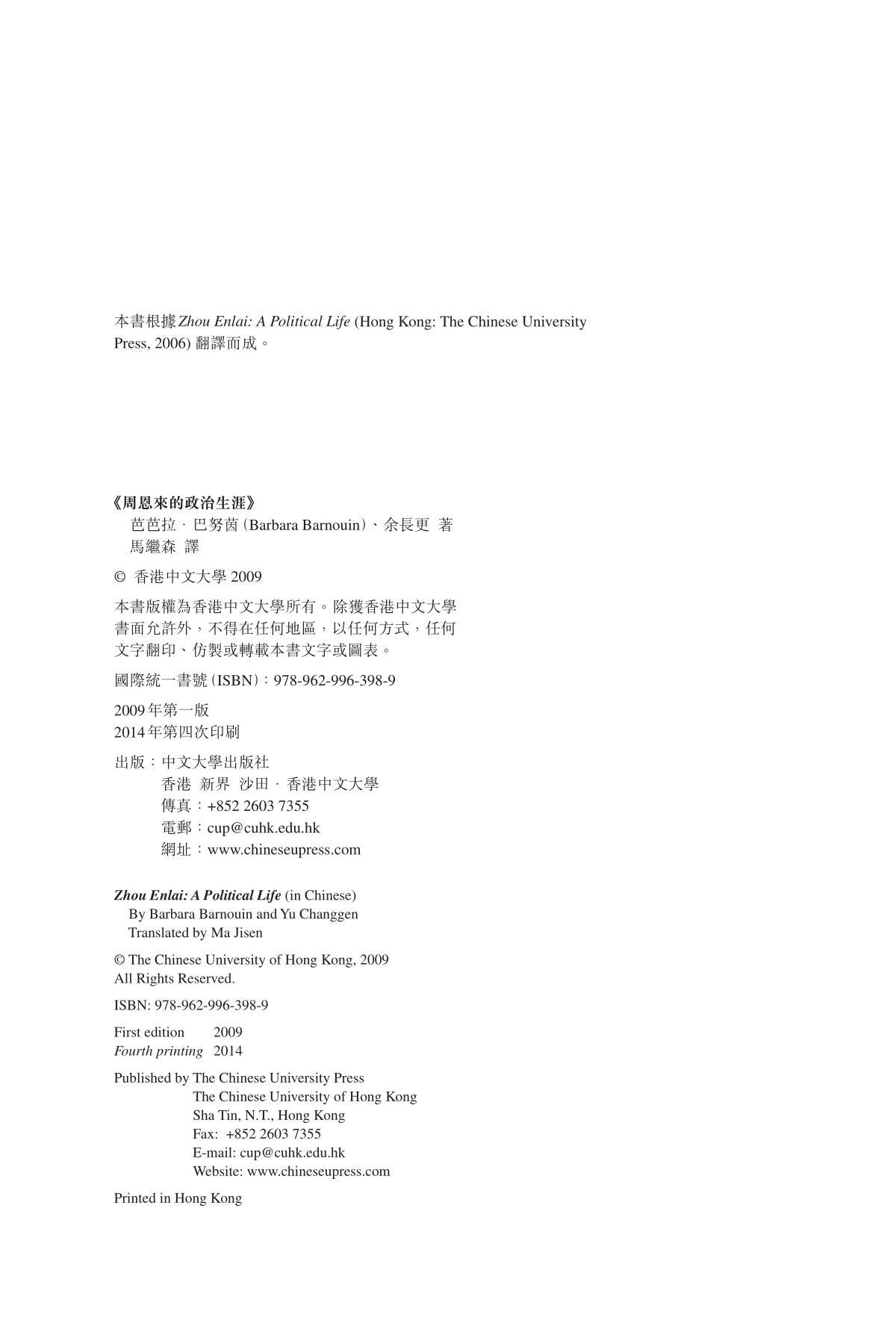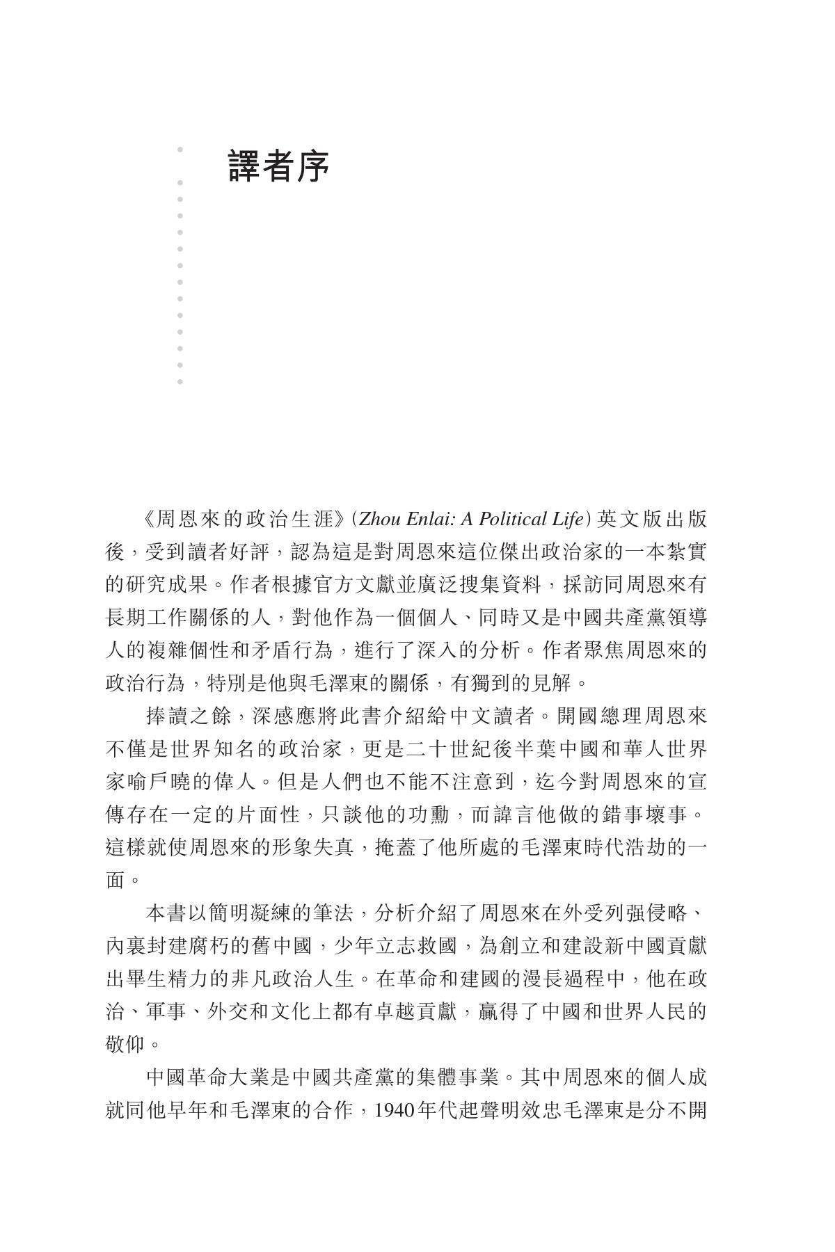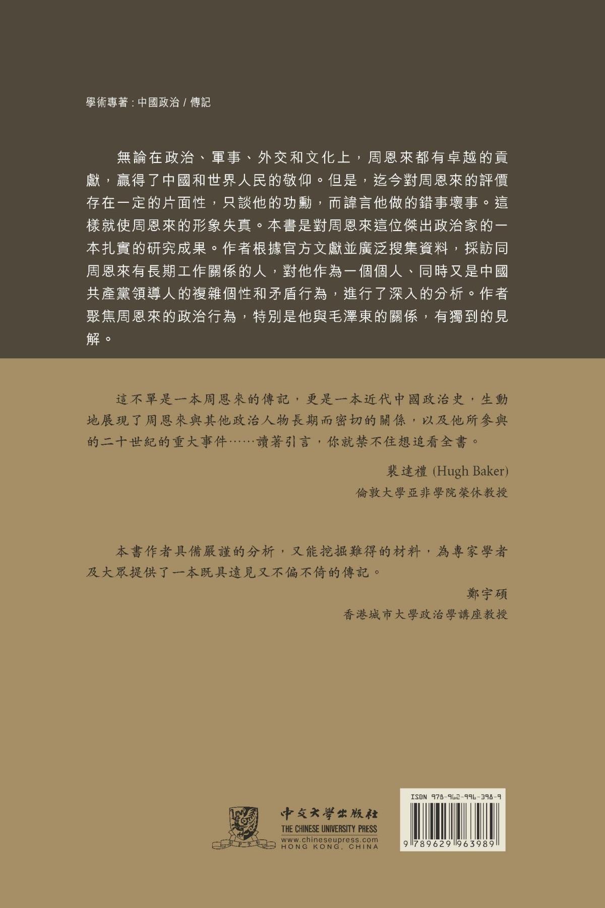 本書是對周恩來這位傑出政治家的一本扎實的研究成果。作者根據官方文獻並廣泛搜集資料,採訪同周恩來有長期工作關係的人,對他作為一個個人、同時又是中國共產黨領導人的複雜個性和矛盾行為,進行了深入的分析。作者聚焦周恩來的政治行為,特別是他與毛澤東的關係,有獨到的見解。