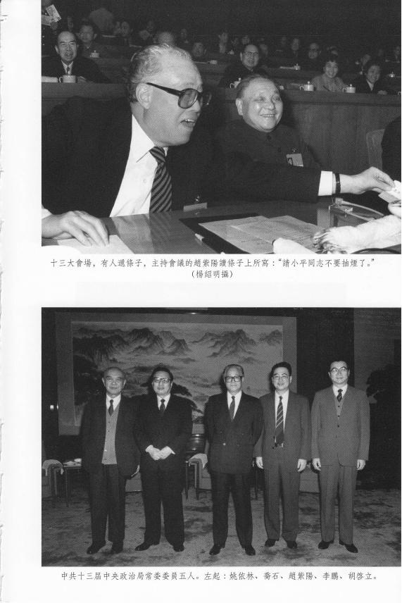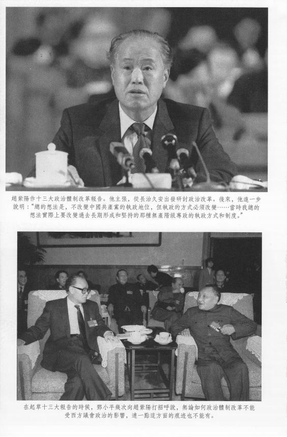 趙紫陽在1980年至1987年是國務院總理;1987年至1989年是中共中央總書記。盡管他的黨不斷地徘徊在權力政治、意識形態和現實生存的要求的沖突之中,他總是在實干中為黨尋找出路。在組織上他從來沒有背棄過這個黨,但在原則和實踐中他始終不渝地站在人民大眾的一面。他在共產黨依靠地主與富農的財源的時候進行了基層的土地改革;他在毛澤東的大躍進和人民公社下面“搞糧食”;他在公有制計劃經濟的大前提下搞“商品經濟”;他保守派的眼皮底下制止了“反精神污染”擴大成為毛式的清洗運動;他在大家長鄧小平的虎視眈眈下反對用軍隊鎮壓人民,他在一黨專制下創造性地倡導全社會對話協商,堅持在民主與法制的軌道上解決問題;身為一個極權主義政黨的代表人物,卻認識到了現代民主的價值。