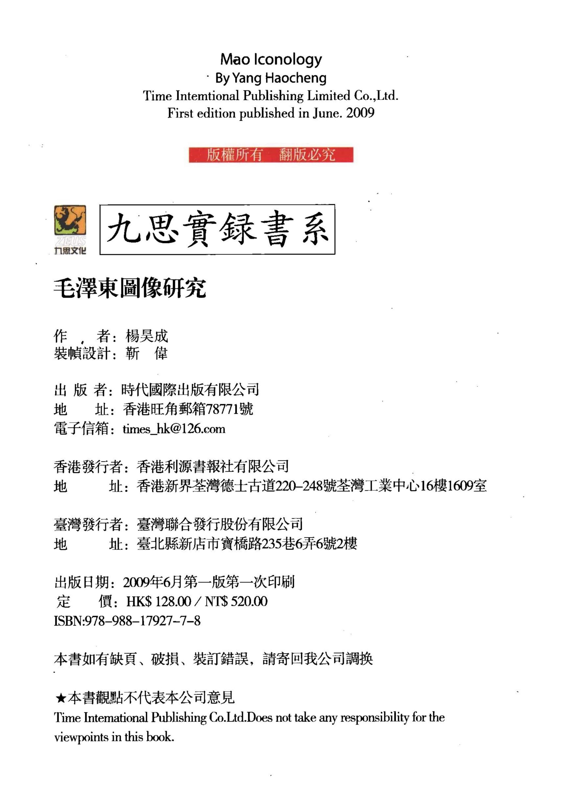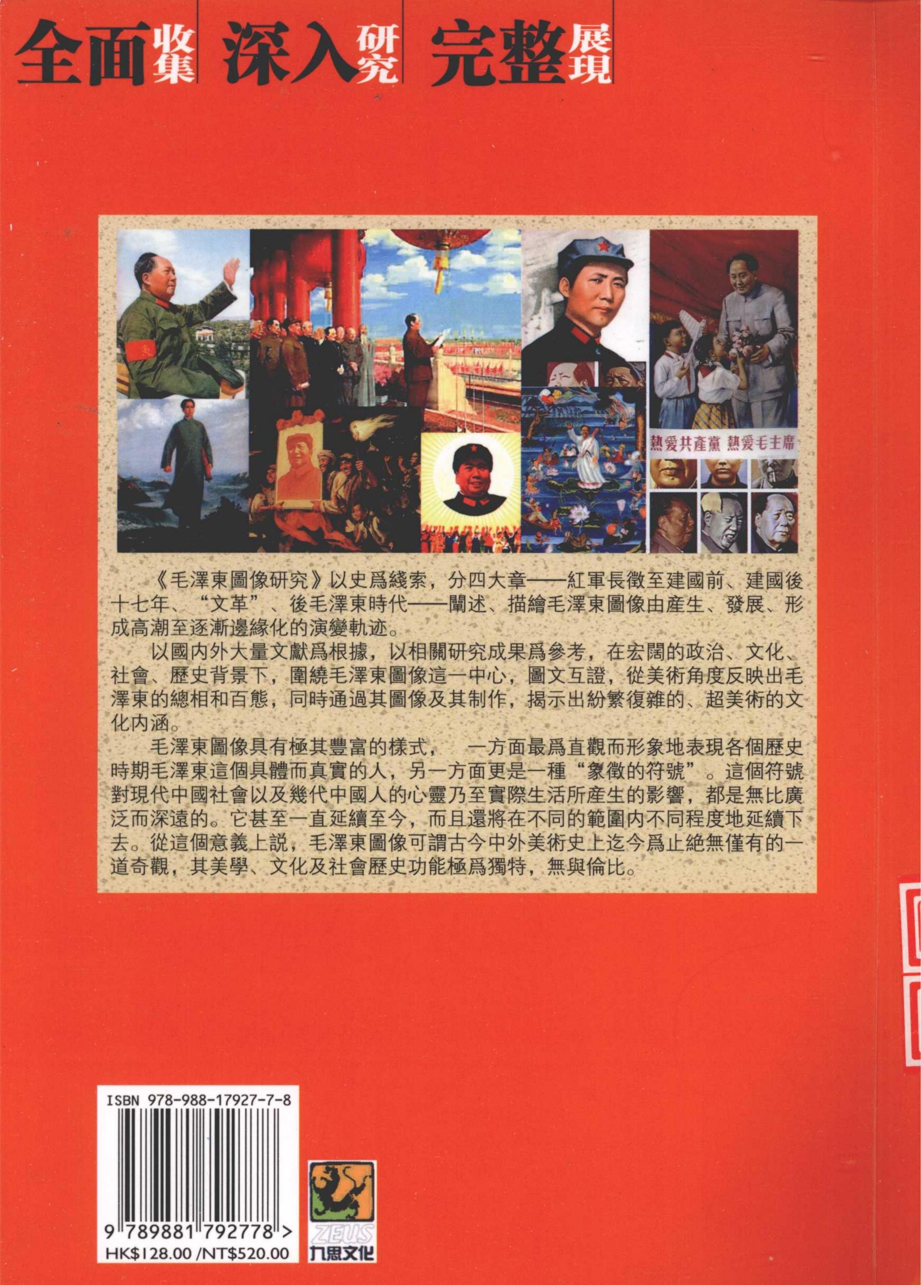 以國内外大量文獻为根據,以相關研究成果为参考,在宏闊的政治、文化、社會、歷史背景下,圍繞毛澤東圖像這一中心,圖文互證,從美術角度反映出毛澤東的總相和百態,同時通過其圖像及其制作,揭示出紛繁復雜的、超美術的文化内涵。