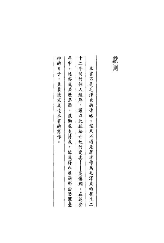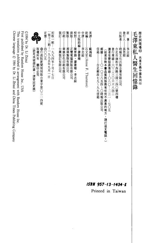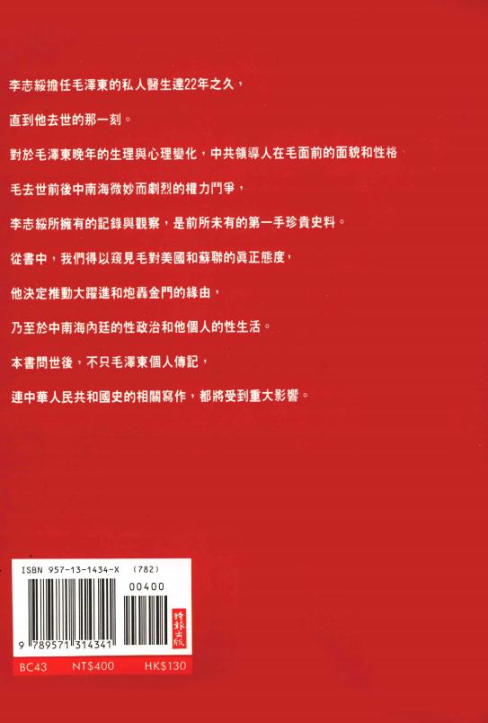 自李醫生離開中國後,他便幾乎完全被官方歷史抹消。中國出版界發行的大量描述毛個人生活的書籍中,只有一、二本提及他。很明顯地,中央曾下達指令–李彷彿未曾存在過。但他的身影牢牢嵌在無法修改的紀錄影片和照片中,而某些可靠來源也確定他的身份。比照官方和半官方的著作,可證實他書中的許多細節,但不同於此書的是,它們都大筆略掉會使這仍仰仗毛的光明形象來行使統治的政權感到難堪的那些層面。沒有任何一本官方傳記呈現了一幅比李醫生此書更真實的毛畫像。此書是有關毛–或許也是有關歷史上任何一位專制者–的著作中,最深刻入微的一本。
