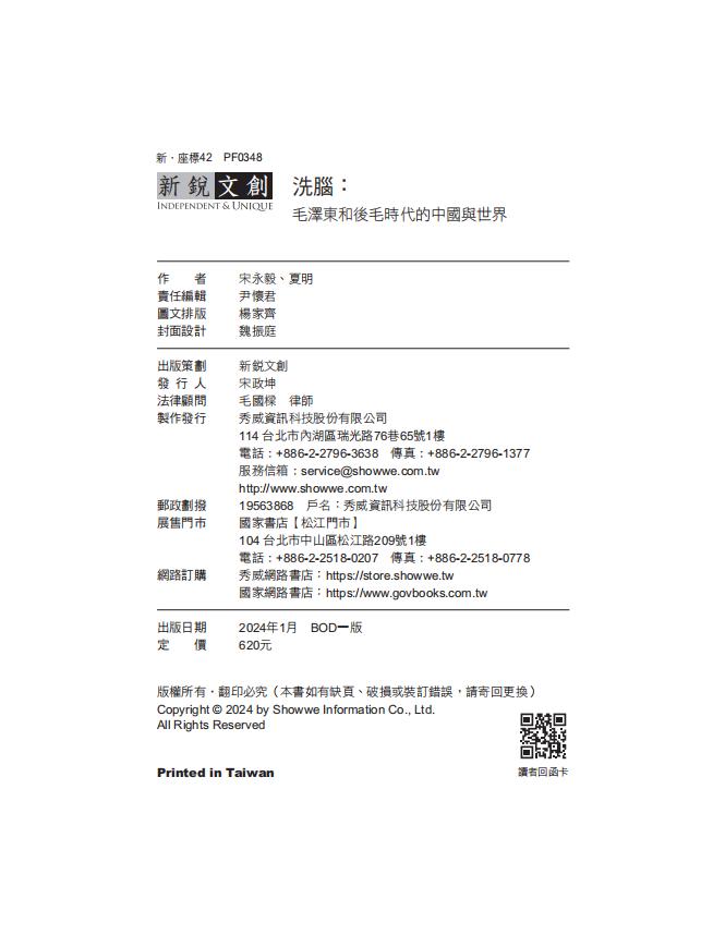 「洗腦」(brainwashing)的理論原是由美國記者愛德華‧亨特於1950年首度提出,專門為研究與討論中共的思想改造而創立。但冷戰結束後,隨著西方對中共本質認識的日益模糊,洗腦一詞在大眾傳播中被日益泛化,並和專制集權的中共逐漸脫鉤。由文革史學家宋永毅主導、在美國召開的「洗腦:毛澤東和後毛時代的中國與世界」(Brainwashing in Mao’s Era of China and Beyond)學術研討會,是一個正本清源的突破。本書為此會議之論文集,由知名漢學家林培瑞作序,主要分為四大部分,收錄二十篇論文,探討的主題充滿了特有的當代性和挑戰性,不僅重新確立了洗腦和中共極權不可分割的關係,還對世界範圍內的「洗腦」惡果,如俄烏戰爭以及美國流行的反民主的陰謀論和民粹主義思潮等進行了精彩的剖析。