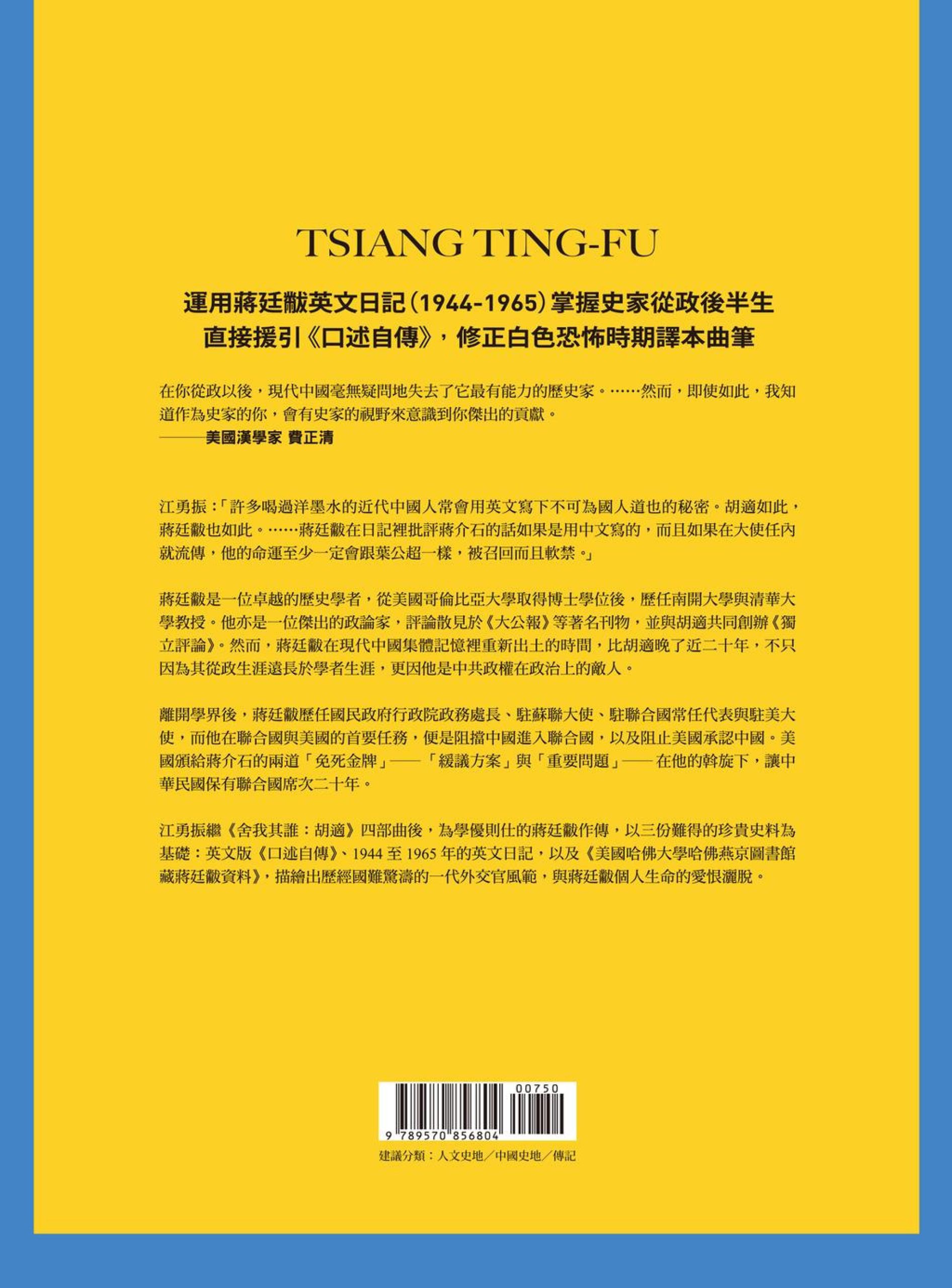 江勇振繼《舍我其誰:胡適》四部曲後,為學優則仕的蔣廷黻作傳,以三份難得的珍貴史料為基礎:英文版《口述自傳》、1944至1965年的英文日記,以及《美國哈佛大學哈佛燕京圖書館藏蔣廷黻資料》,描繪出歷經國難驚濤的一代外交官風範,與蔣廷黻個人生命的愛恨灑脫。