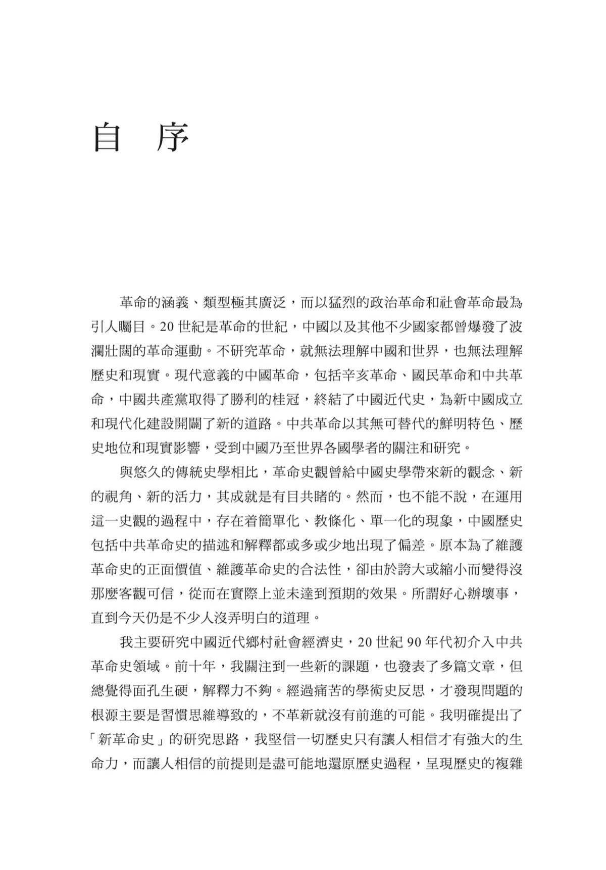 本書內容主要包括:一,「新革命史」研究的理念和方法。率先提出新革命史學術概念,宣導使用常識、常情、常理以及相關學科理論對中共革命史進行重新審視和研究,以呈現中共革命的運作形態尤其是艱難、曲折與複雜性;二,中共革命與鄉村社會的互動關係。對土地改革中的農民心態、農民參加革命的動機、革命策略與傳統制約等經典問題,提出了新的解釋;三,中共革命的其他面相。對中共革命的理論依據、革命動力、革命傳播以及中共革命形象等問題,進行了描述和分析。