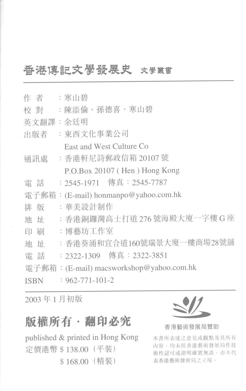 《香港传记文学发展史》系香港艺术发展局资助之研究计划项目。因限期完成,寒山碧先生“经八百个日日夜夜,奋笔疾书”,终成此书。这部40余万字的新著,凝聚着著者多年来的心血结晶。它从追踪香港传记文学的发展轨迹中,描摹了香港传记文学的斑斓景观,展示了香港传记文学创作的丰硕成果,让我们管窥到香港传记文学的流变走向,可谓创获良多,功德无量。