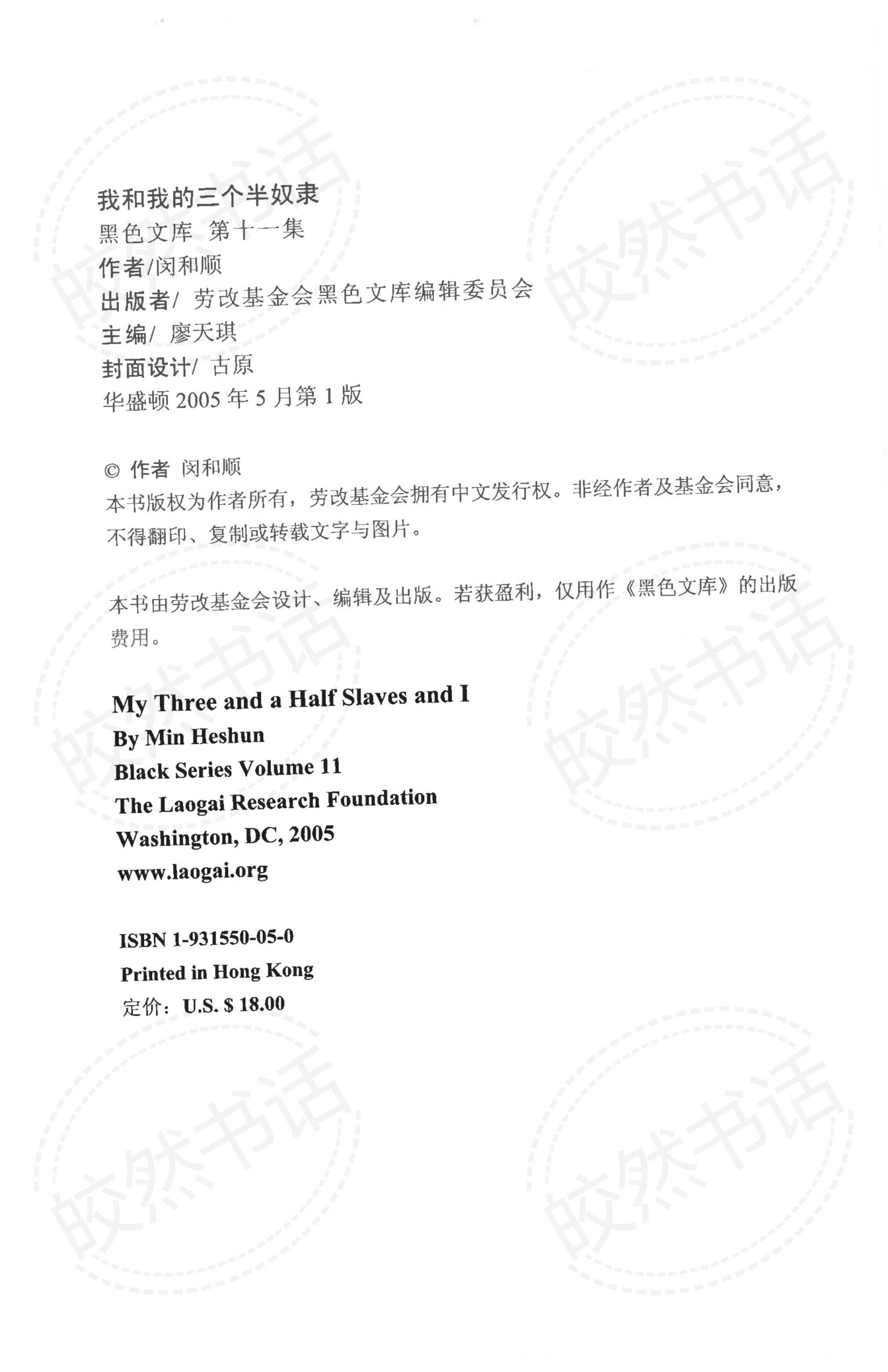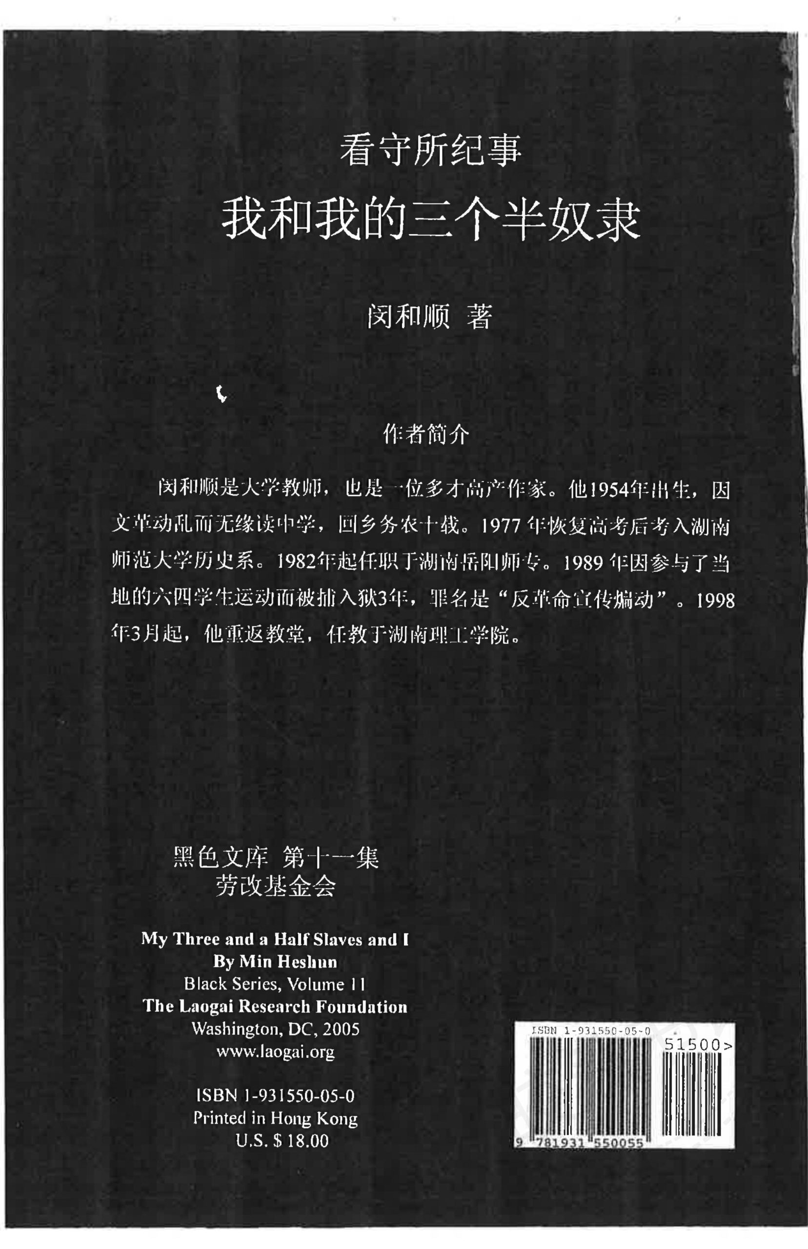 《我和我的三個半奴隸》是《黑色文庫》的勞改犯傳記系列的第十一集。本書和他的作者頗有一些特色,跟文庫中的前幾本有很大的不同。首先,這不是描寫犯人在勞改農場、工廠或礦場被迫強迫勞動的悲慘記述。這些尚未接到起訴書、被關在看守所等待判刑的準犯人,像是動物園籠子裡豢養的動物,每天只是吃喝拉撒睡在一塊狹小的空間,彼此以折磨、毆鬥、傾軋來打發過剩的精力和煩躁的心情,其中不乏驚心動魄的殘忍場景、令人噴飯的荒謬對話和讓人動容、有人情味的片斷。作者閔和順是岳陽師專的講師,因參加八九民運,「六四屠殺」之後就被捕,先關在該市收審所一個多月,之後轉到看守所關了八個月的時間。最後以「反革命宣傳煽動罪」判刑三年。